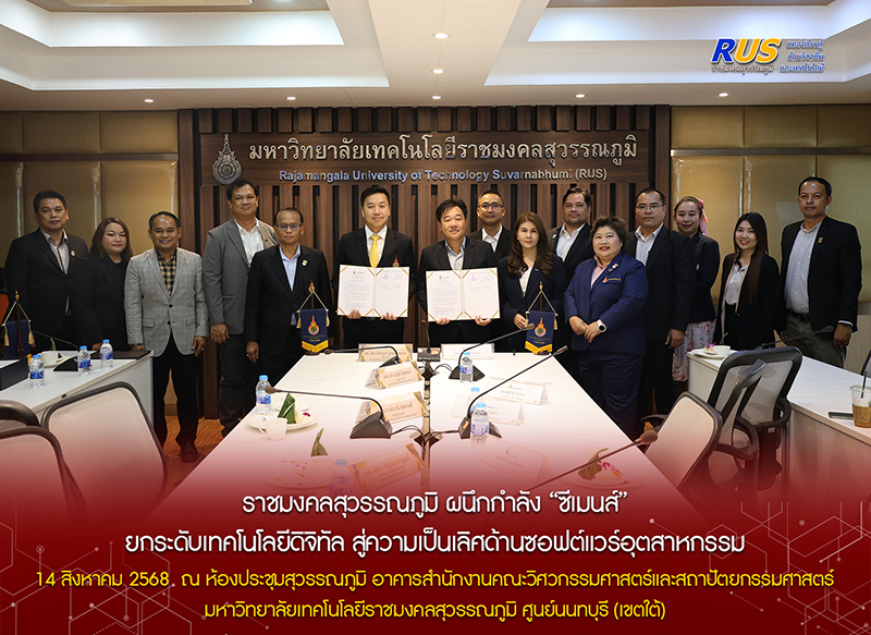 เมื่อวันพฤหัสบดีที่ 14 สิงหาคม พ.ศ. 2568 ณ ห้องประชุมสุวรรณภูมิ อาคารสำนักงานคณะวิศวกรรมศาสตร์และสถาปัตยกรรมศาสตร์ มหาวิทยาลัยเทคโนโลยีราชมงคลสุวรรณภูมิ ศูนย์นนทบุรี (เขตใต้) ได้มีพิธีลงนามบันทึกข้อตกลงความร่วมมือระหว่างมหาวิทยาลัยฯ กับ บริษัท ซีเมนส์ จำกัด แผนกดิจิทัล อินดัสทรีส์ ซอฟต์แวร์ เพื่อร่วมกันพัฒนาองค์ความรู้ด้านเทคโนโลยีสารสนเทศและซอฟต์แวร์อุตสาหกรรม