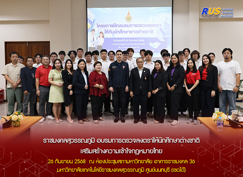 เมื่อวันศุกร์ที่ 26 กันยายน พ.ศ. 2568 ณ ห้องประชุมสภามหาวิทยาลัย อาคารราชมงคล 36 มหาวิทยาลัยเทคโนโลยีราชมงคลสุวรรณภูมิ ศูนย์นนทบุรี (เขตใต้) ผู้ช่วยศาสตราจารย์ ดร.สุวุฒิ ตุ้มทอง รองอธิการบดี ผู้แทนอธิการบดี เป็นประธานเปิดโครงการฝึกอบรม “การตรวจลงตราสำหรับนักศึกษาชาวต่างชาติ” โดยมี อาจารย์วนิดา วงศ์บรรณาคม ผู้ช่วยอธิการบดี กล่าวรายงานถึงความเป็นมาของโครงการ