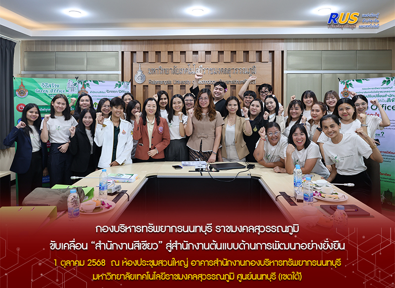 เมื่อวันพุธที่ 1 ตุลาคม พ.ศ. 2568 มหาวิทยาลัยเทคโนโลยีราชมงคลสุวรรณภูมิ เดินหน้าขับเคลื่อนองค์กรสู่การเป็นสำนักงานสีเขียว (Green Office) อย่างจริงจัง โดยมี ผู้ช่วยศาสตราจารย์ ดร.ศศิกานต์ สุวรรณประทีป นำคณะกรรมการตรวจประเมินภายใน ลงพื้นที่ตรวจประเมินผลการดำเนินงานประจำปี 2568 ณ อาคารสำนักงานกองบริหารทรัพยากรนนทบุรี มหาวิทยาลัยเทคโนโลยีราชมงคลสุวรรณภูมิ ศูนย์นนทบุรี (เขตใต้)