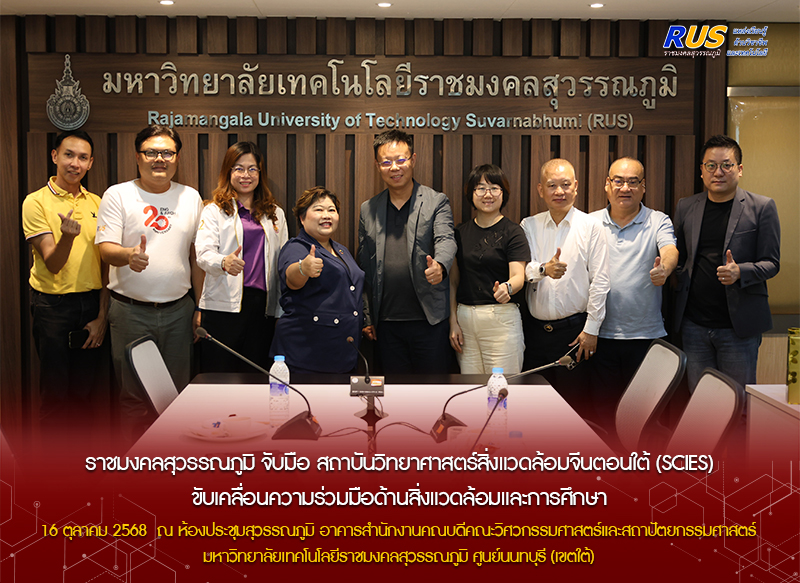 เมื่อวันพฤหัสบดีที่ 16 ตุลาคม พ.ศ. 2568 รองศาสตราจารย์ ดร.ประมุข อุณหเลขกะ อธิการบดีมหาวิทยาลัยเทคโนโลยีราชมงคลสุวรรณภูมิ ได้มอบหมายให้คณะผู้บริหารมหาวิทยาลัยฯ เข้าร่วมประชุมหารือและแลกเปลี่ยนความคิดเห็น กับ คณะผู้บริหารจากสถาบันวิทยาศาสตร์สิ่งแวดล้อมจีนตอนใต้ (South China Institute of Environmental Sciences : SCIES) กระทรวงนิเวศวิทยาและสิ่งแวดล้อม จากสาธารณรัฐประชาชนจีน เพื่อส่งเสริมส่งเสริมกิจกรรมภายใต้บันทึกข้อตกลงความร่วมมือ ด้านเทคโนโลยีการใช้ทรัพยากรหมุนเวียนและการป้องกันมลพิษพัฒนาความร่วมมือทางการศึกษา และความร่วมมืออื่น ๆ