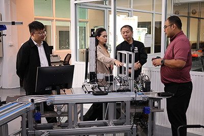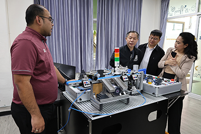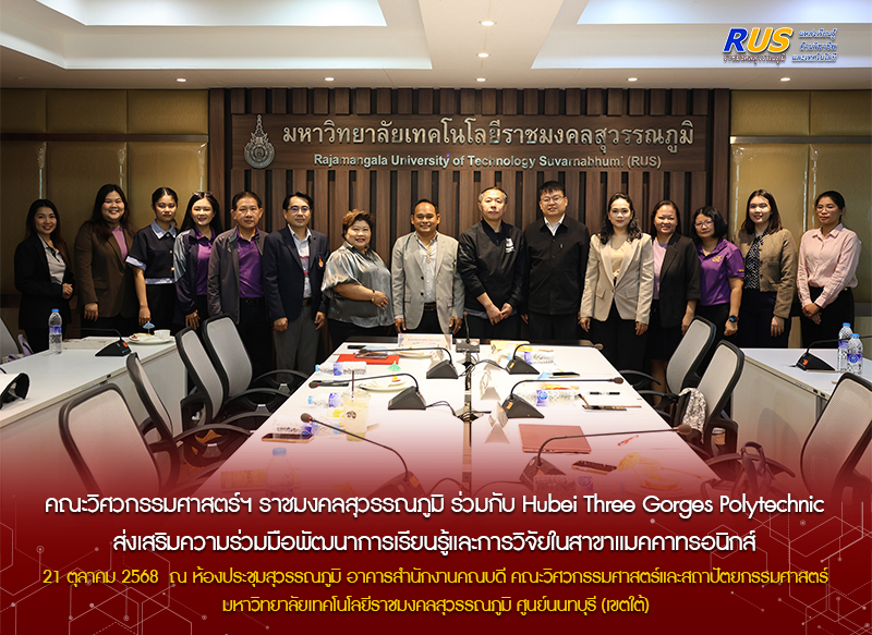 เมื่อวันอังคารที่ 21 ตุลาคม พ.ศ. 2568 ผู้ช่วยศาสตราจารย์พัชระ กัญจนกาญจน์ คณบดีคณะวิศวกรรมศาสตร์และสถาปัตยกรรมศาสตร์ มหาวิทยาลัยเทคโนโลยีราชมงคลสุวรรณภูมิ กล่าวต้อนรับ Mr. LV Xuesong the head of the “Industrial Robot Technology” major Hubei Three Gorges Polytechnic Mr. LI Yi the teaching assistant จากสาธารณรัฐประชาชนจีน และ นางสาวศุภารัตน์ คงราศรี ผู้จัดการโครงการ ประจำประเทศไทย บริษัท Beijing Huatec Information Technology จำกัด พร้อมเปิดกิจกรรมส่งเสริมความร่วมมือทางวิชาการ ประชุมหารือด้านการเรียนการสอนและการวิจัย ในสาขาแมคคาทรอนิกส์ และเยี่ยมชมห้องปฏิบัติการสาขาวิชาเมคคาทรอนิกส์ และห้องปฏิบัติการระบบอัตโนมัติและหุ่นยนต์