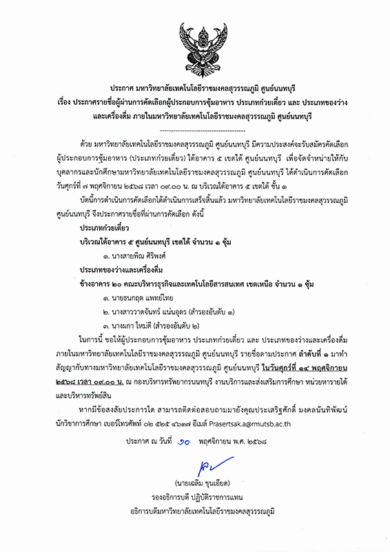 ประกาศ มทร.สุวรรณภูมิ ศูนย์นนทบุรี เรื่อง ประกาศรายชื่อผู้ผ่านการคัดเลือกผู้ประกอบการซุ้มอาหาร ประเภทก๋วยเตี๋ยว และ ประเภทของว่างและเครื่องดื่ม