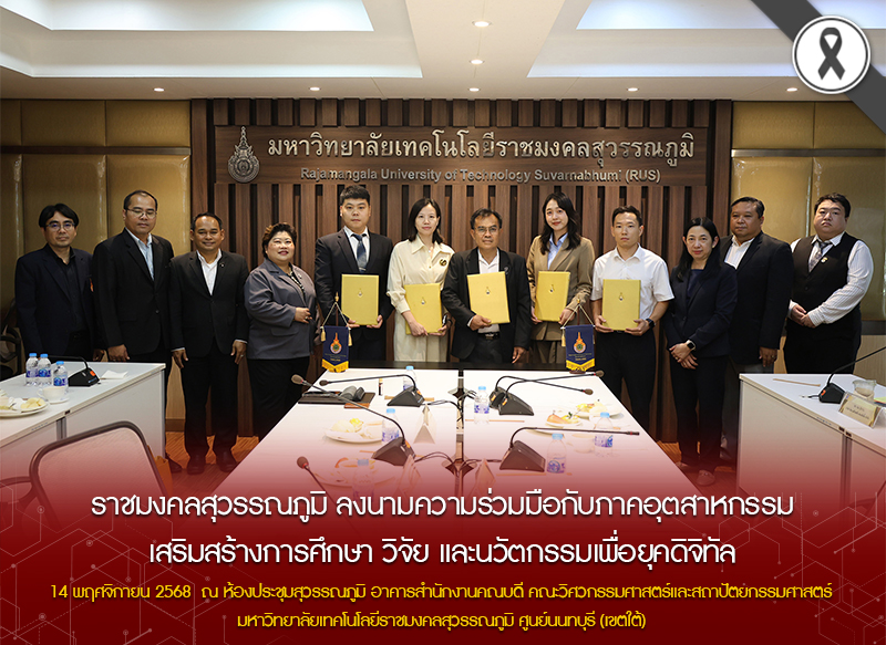 เมื่อวันศุกร์ที่ 14 พฤศจิกายน พ.ศ. 2568 ณ ห้องประชุมสุวรรณภูมิ อาคารสำนักงานคณบดี คณะวิศวกรรมศาสตร์และสถาปัตยกรรมศาสตร์ มหาวิทยาลัยเทคโนโลยีราชมงคลสุวรรณภูมิ ศูนย์นนทบุรี (เขตใต้) ได้มีพิธีลงนามบันทึกข้อตกลงความร่วมมือระหว่างมหาวิทยาลัยฯ กับ บริษัท ดาฮัว แอคเคาท์ แอนด์แท็กซ์ (ไทยแลนต์) จำกัด, บริษัท เอช วาย ชี ออปติคัล คอมมิวนิเคชั่น (ไทยแลนด์) จำกัด, บริษัท กู๊ด จ็อบ ทาเส้นท์ กรุ๊ป (ไทยแลนด์) จำกัด และ บริษัท ไอเอ็ม ตัน อินเตอร์เนชั่นแนล โลจิสติกส์ จำกัด เพื่อส่งเสริมการพัฒนาการบริการวิชาการ การวิจัยและนวัตกรรม รวมถึงการพัฒนาหลักสูตรการเรียนการสอนที่เน้นสมรรถนะและตอบโจทย์ตลาดแรงงานในยุคดิจิทัล