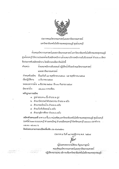 ประกาศ คณะวิศวกรรมศาสตร์และสถาปัตยกรรมศาสตร์ มทร.สุวรรณภูมิ ศูนย์นนทบุรี เรื่อง รายละเอียดและเงื่อนไขการจ้างเหมาบริการพนักงานขับรถประจำคณะ