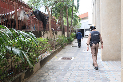 ทั้งนี้ ผู้ช่วยศาสตราจารย์เฉลิม ขุนเอียด รองอธิการบดีประจำศูนย์พื้นที่นนทบุรี ได้มอบหมายให้ นางสาวมณฑิรา สาระพันธ์ รักษาการในตำแหน่ง ผู้อำนวยการกองบริหารทรัพยากรนนทบุรี และ ดร.กฤษณะ จิรสารสวัสดิ์ รองคณบดี คณะวิศวกรรมศาสตร์และสถาปัตยกรรมศาสตร์ (ด้านงานพัฒนานักศึกษา) ให้การต้อนรับและร่วมลงพื้นที่กับเจ้าหน้าที่ตำรวจ เพื่อบูรณาการความร่วมมือด้านความปลอดภัยในสถานศึกษาอย่างเป็นรูปธรรม